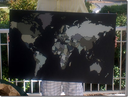 So this is actually a gift I created two Christmases ago. I just kept forgetting to post about it but I just got a new laptop and am trying to organize everything. In searching through my photos, I found these. I created this for my boyfriend because he loves maps. I picked gray for the countries (there are 10 shades there) because after blue (which clearly had to be used for the water) it is his favorite color. I used this projection method again. Because I am a bit OCD, I had to make sure no same colors touched, so I had to number each country’s paint color (1-10) before painting. Yes, you really do need 10 different colors, Africa and Eastern Europe gets a bit tricky. This project was a labor of love, it took me about 2-3 weeks. I painted in between studying for finals. I would study for 45 minutes then paint for 15. I needed about 3 layers of paint so there was a lot of drying time. It wasn’t too tricky just time consuming. I used a black paint pen to trace the country outlines and used Martha Stewart Gloss Finish to seal it once done (about 3 layers again). I also put foam core board behind it, so you could place pins in it. It is 36 by 48 inches.
